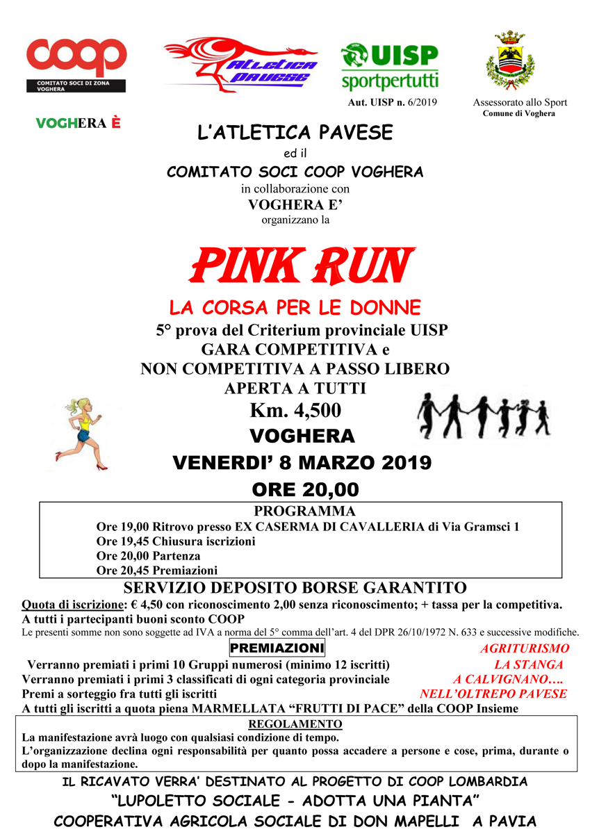 Puntuale come tutti gli anni, l’8 marzo torna a Voghera, la Pink Run, la corsa benefica in notturna organizzata dall’Atletica Pavese e dal Comitato Soci Coop di Voghera.