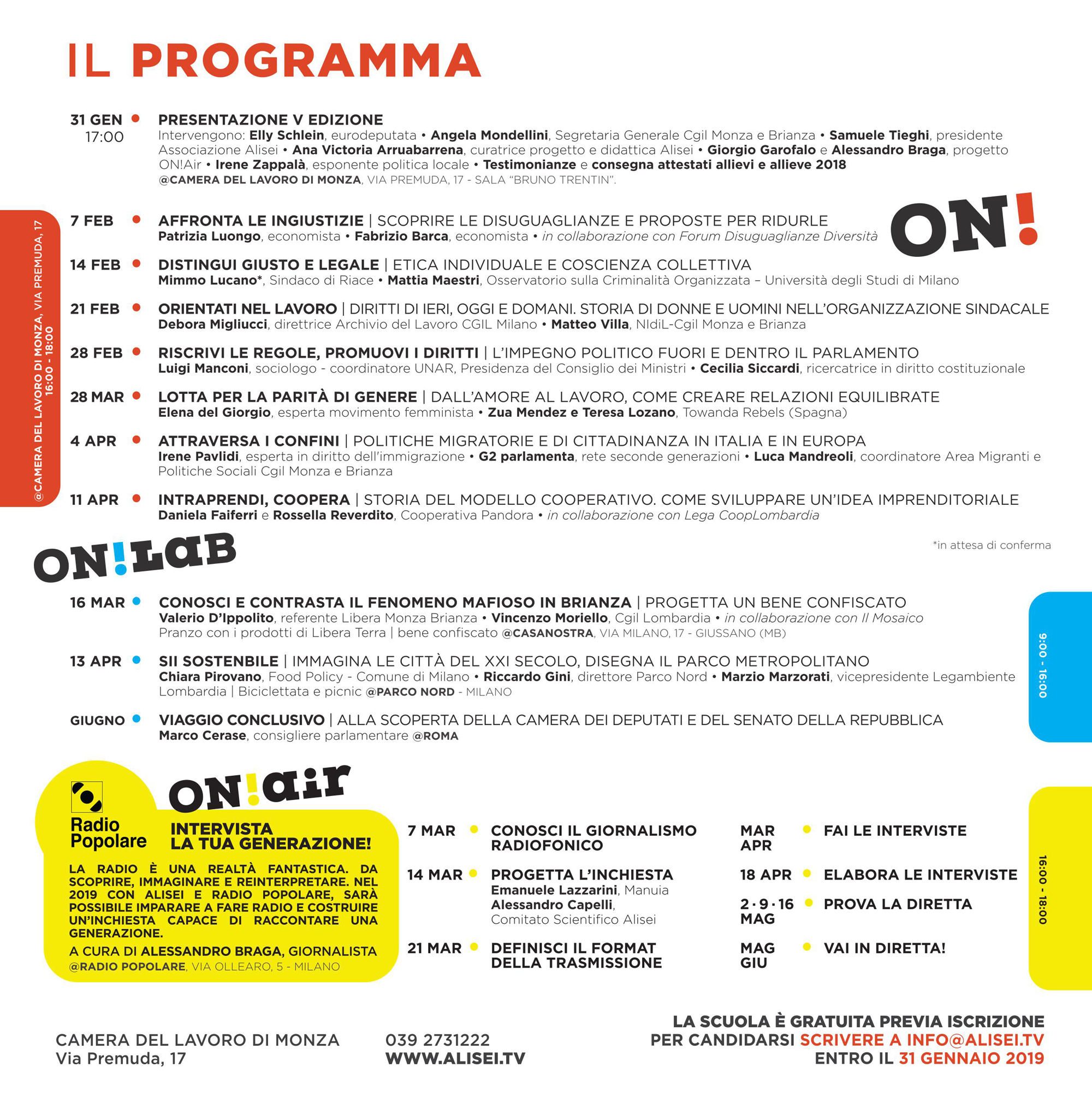 Numerose anche le partnership. Sono otto infatti le realtà associative e gli enti che hanno deciso di collaborare con la Cgil brianzola: Legambiente, Libera, Forum disuguaglianze diversità, Legacoop Lombardia, Manuia – policies for happiness, Parco Nord, Il Mosaico e Radio Popolare, che grazie ad uno specifico laboratorio, curato dal giornalista Alessandro Braga, offrirà agli studenti l’opportunità di “fare radio”, con la produzione e la messa in onda di una vera e propria diretta “ON! Air”.