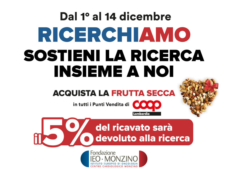 Fino al 14 dicembre nei punti vendita Coop Lombardia torna “RicerchiAMO. Mangia sano, la salute vince”, l’iniziativa che permette a Soci, Socie e Clienti di sostenere la Ricerca medico-scientifica: acquistando frutta secca contrassegnata dall’etichetta dell’iniziativa, il 5% del ricavato verrà infatti devoluto alla Fondazione IEO-MONZINO ETS, che supporta i progetti dell’Istituto Europeo di Oncologia e del Centro Cardiologico Monzino.