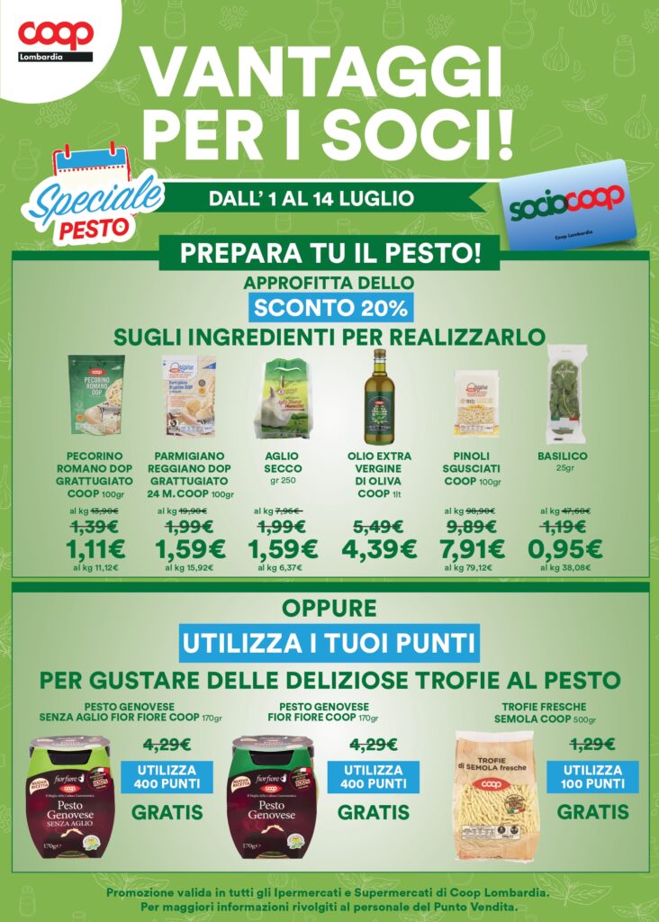 Con la promozione riservata ai Soci, con 400 punti Socio Coop potrai scegliere tra il pesto genovese FiorFiore Coop o la sua variante senza aglio FiorFiore Coop. Qualsiasi sia la ricetta che preferisci, potrai apprezzare questi pesti pronti con le trofie fresche di semola Coop, prodotte con materie prime al 100% italiane, utilizzando 100 punti  Socio Coop.